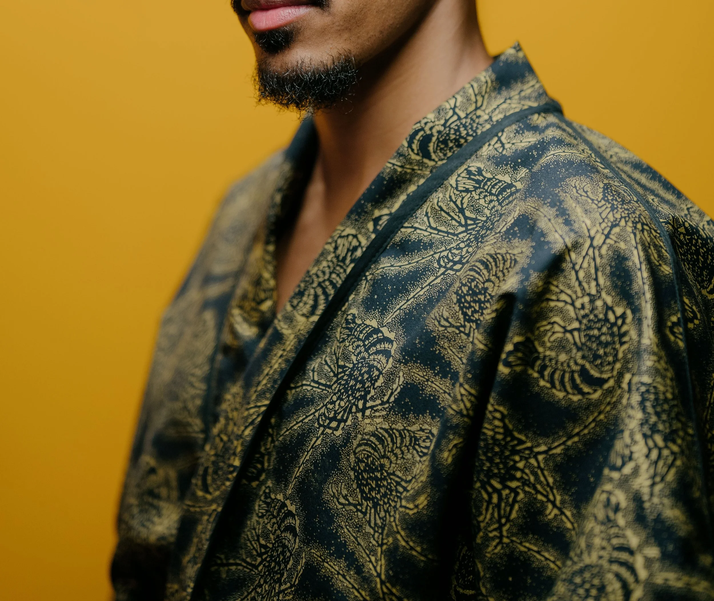 Technique — Impression monochrome encre à eau dorée sur jersey noir et denim